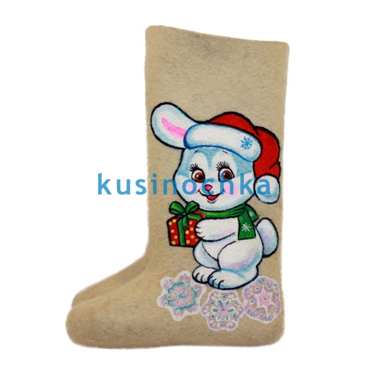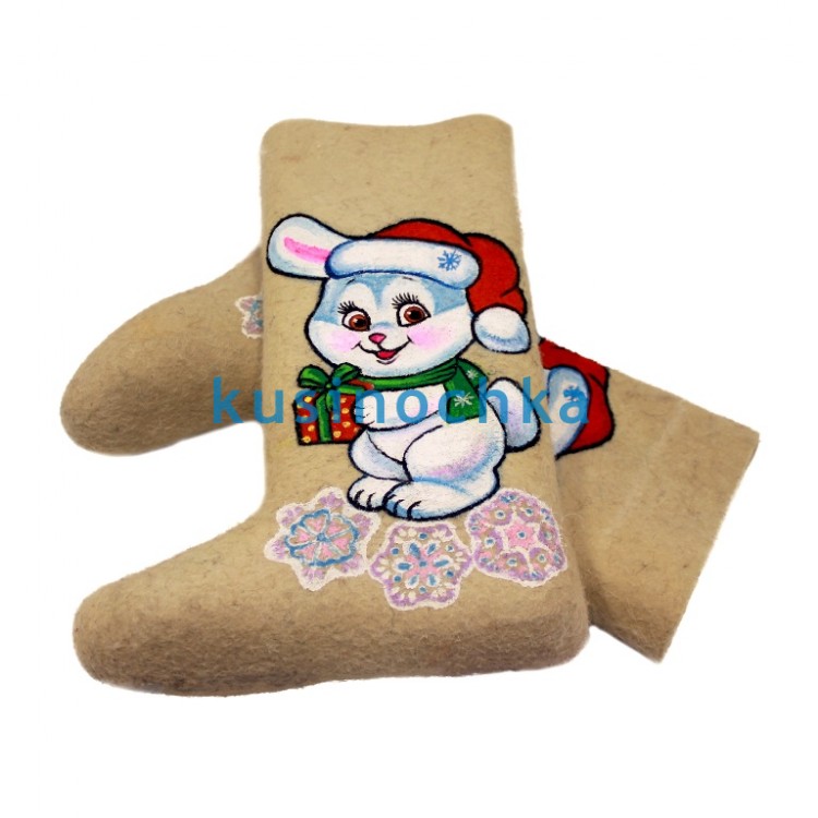 Универсальная модель для детей 2–10 лет — с добрым, лаконичным рисунком зайчика, выполненным акриловыми красками вручную. Нейтральный, дружелюбный образ подходит как девочкам, так и мальчикам, а мягкие контуры и приглушённая палитра вписываются в любой зимний образ — от сказочного до городского.