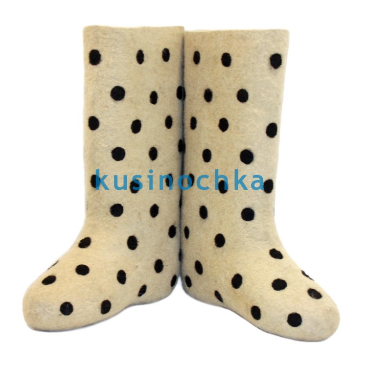 Классика в современном исполнении: светлые (бежево-молочные) валенки с аккуратными чёрными кружочками. Нейтральный, но выразительный узор подходит как девочкам, так и мальчикам — он не диктует образ, а дополняет его: спокойный, но не скучный; модный, но не вычурный.