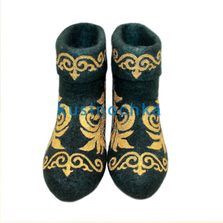Полуваленки ручной валки на тёмно-зелёной основе, с золотым узором, нанесённым по передней поверхности и отворотам. Рисунок — абстрактный или стилизованный (завитки, ветви, геометрические повторы), выполненный акриловой краской с матовым золотистым пигментом (не блёстками, без излишнего блеска — скорее, тёплый, природный отсвет).