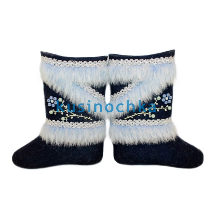 Композиция выдержана в духе традиционного народного убранства, но без буквального копирования: узор — стилизованный растительный орнамент, симметричный, с акцентом на верхнюю часть валенка. Образ — сдержанный, но не строгий: богатство в деталях, а не в объёме.