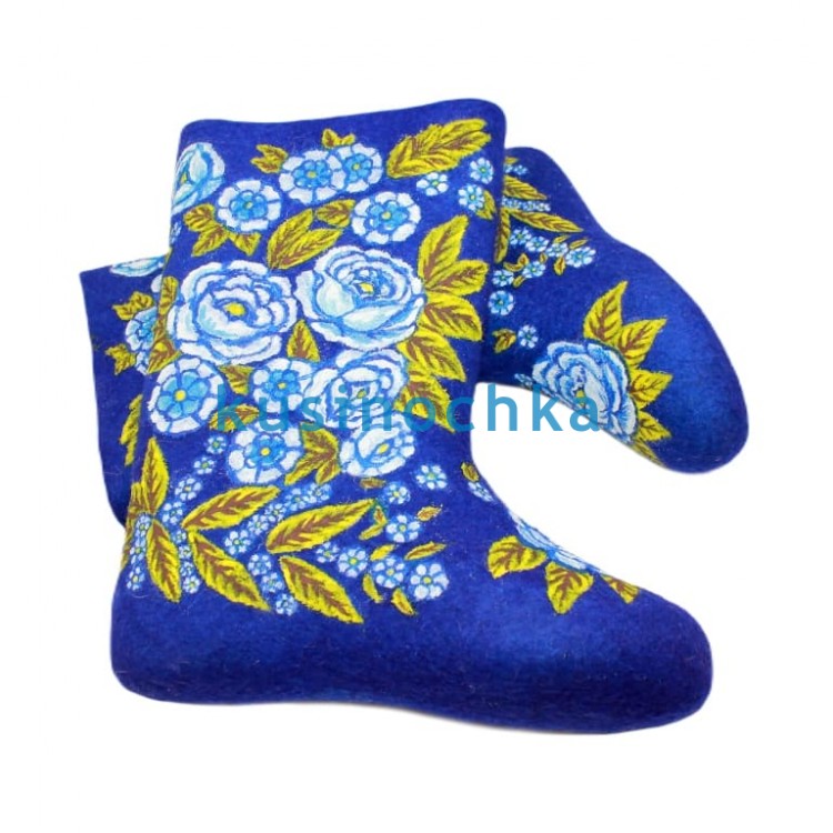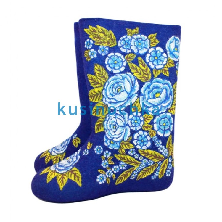 Полноразмерные валенки ручной валки на синей основе, с декоративным цветочным узором: голубые цветы в сочетании с листьями золотисто-зелёного оттенка. Композиция стилизована — не натуралистичная, а сбалансированная по объёму и ритму: крупные бутоны чередуются с изящными листьями, создавая ощущение завершённого, но не перегруженного орнамента.