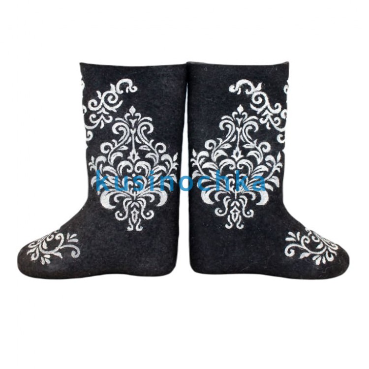 Полноразмерные валенки ручной валки на чёрной основе, с абстрактным узором, выполненным белой акриловой краской. Композиция — геометрические повторы, линии, завитки или стилизованные растительные мотивы — выстроены с акцентом на ритм и баланс. Контраст чёрного и белого создаёт эффект графичной чёткости без агрессии.