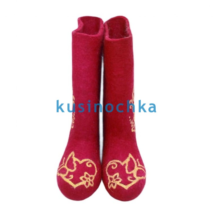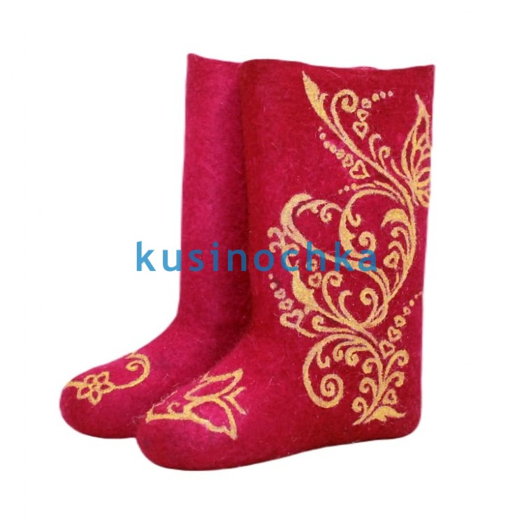 Полноразмерные валенки ручной валки на красной основе, с абстрактным растительным орнаментом, выполненным золотистой акриловой краской (матовый пигмент, без блёсток). Узор — волны, завитки, намёки на колосья или листья — выдержан в сдержанной, почти графической манере. Золото работает как акцент, а не как доминанта: теплое, но не кричащее.