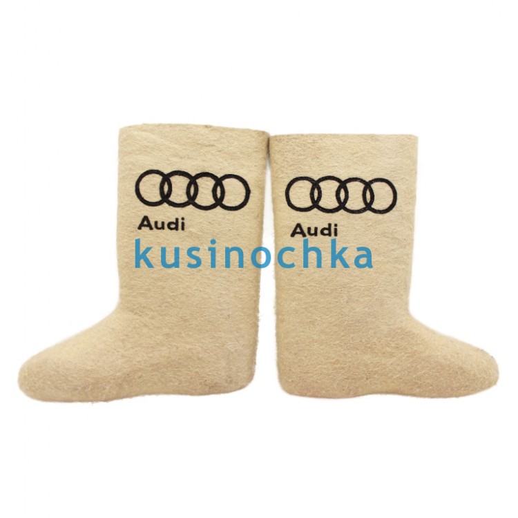 Валенки ручной валки, предназначены для персонализации под индивидуальный заказ — в том числе с нанесением логотипов, названий брендов, слоганов или эмблем по предоставленному клиентом макету. Пример с надписью «AUDI» иллюстрирует реализацию заказа для корпоративного клиента (например, дилерского центра, клуба владельцев, партнёрской программы), с соблюдением требований к фирменному стилю.