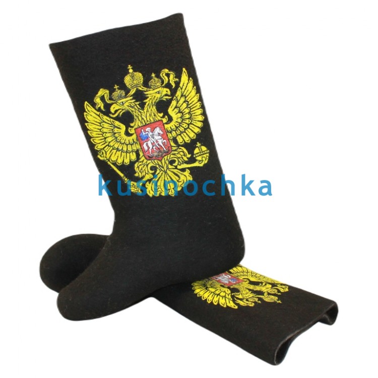 Полноразмерные валенки ручной валки на чёрной основе, с центральным элементом — гербом Российской Федерации, выполненным в соответствии с официальным описанием. Герб расположен на передней части валенка, в верхней трети — для лучшей читаемости. Фон остаётся чистым, чтобы символ оставался фокусом.