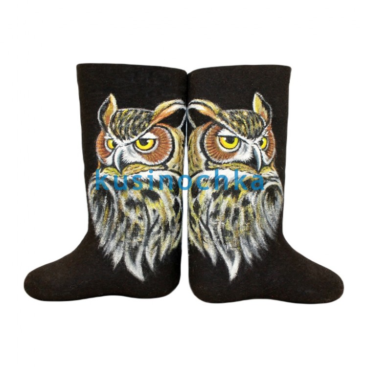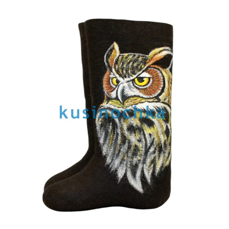 Полноразмерные валенки ручной валки на чёрной основе, с художественным рисунком — голова и шея совы, выполненные акриловыми красками. Образ стилизован: крупные глаза, выраженные «брови», мягкие контуры оперения. Палитра — белая, серая, коричневая, с чёрными деталями для глубины. Фон остаётся чистым, чтобы силуэт оставался центром внимания.