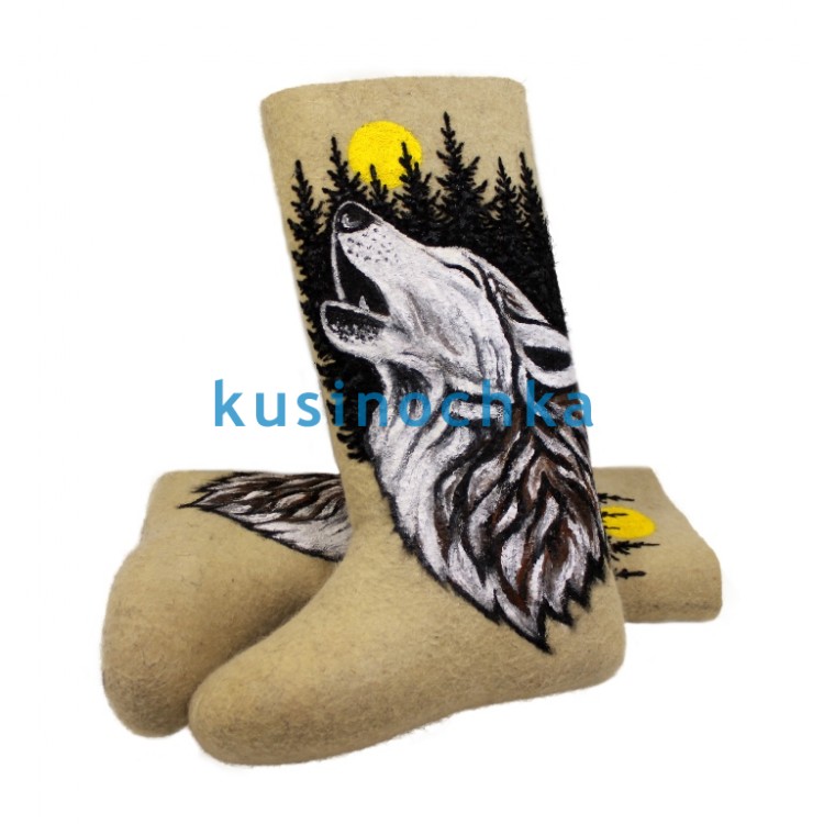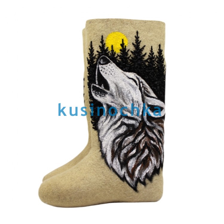 Полноразмерные валенки ручной валки на светлой основе, с художественным рисунком: волк, обращённый к луне, за которой — силуэты тёмного леса. Композиция выдержана в графичной, почти силуэтной манере: луна — круглая, светлая; лес — вертикальные тени; волк — крупный, с поднятой мордой, но без агрессии — скорее, как символ бодрствования, связи с природой.
